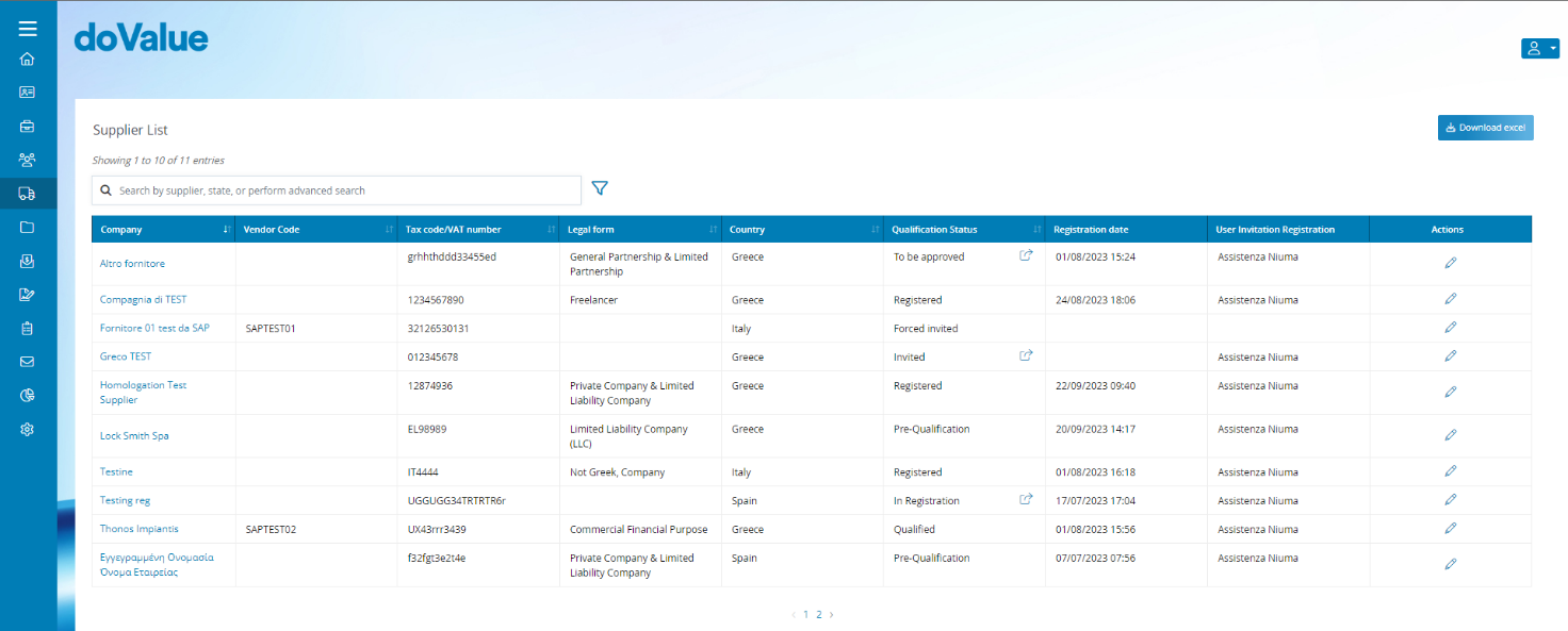 In this section, internal users can access a comprehensive list of suppliers presented in a table format. The table includes the following columns: Company Name, Vendor Code, Tax Code, Legal Form, Country of Supplier, Qualification Status, Registration Date, and an Action column featuring an icon for accessing company data editing.