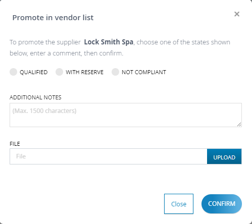 In the pop-up screen that appears, the internal can choose to either qualify the supplier (select the Qualified option), qualify it conditionally (select the With Reserve option), or deem it ineligible (select the Not Compliant option). The internal user has the flexibility to change the supplier's evaluation status at any time.