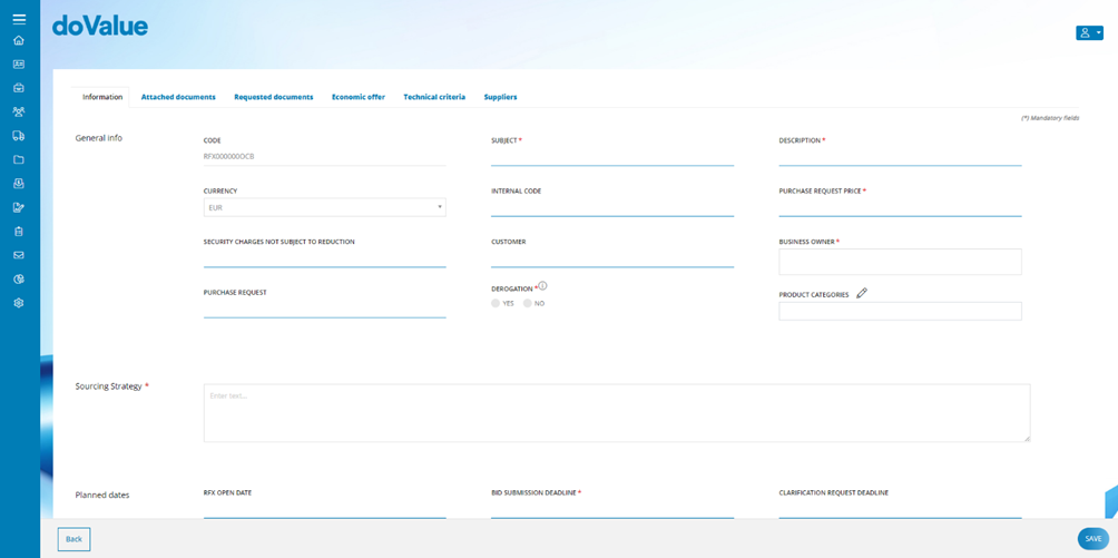 User input follows a logical order, corresponding to the sequence of tabs mentioned earlier. Upon saving, the system performs a mandatory data check across all sections of the new RFx. If any required information is missing, the system will redirect the internal user to the relevant section.
