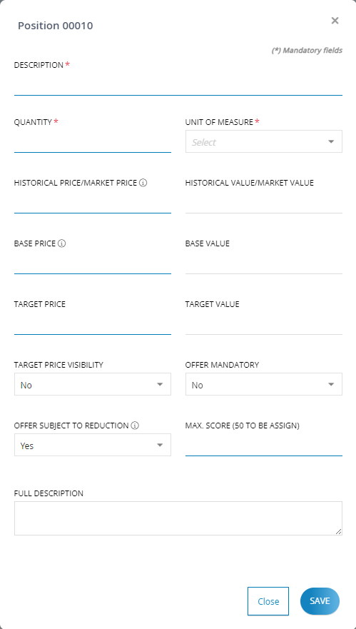 The internal user can either click the 'Close' button to close the pop-up without making any changes to the database, or click the 'Save' button to load the position, close the pop-up, and have the system display the position in the list within the 'Economic Offer' tab.