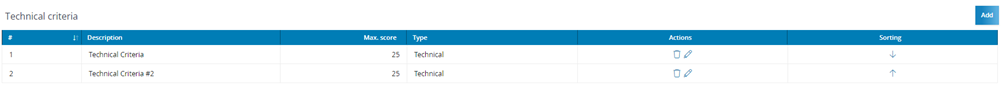 Depending on the configuration selected during the loading of the new tender (RFx), the system will either display or hide the additional 'Technical Criteria' tab. This section will be enabled only if 'Economically More Advantageous Offer' has been selected as the 'Type of Award,' allowing the internal to define the technical criteria of the tender.
