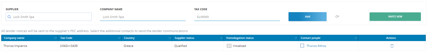 When the internal user selects a supplier, the system will automatically populate the 'Company name' and 'Tax code' fields visible on the right. Clicking the 'Add' button will finalize the operation and display the supplier's record in the suppliers table right below.