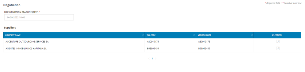 On this page, the user can choose the suppliers to invite to the negotiation by selecting the respective checkboxes in the ‘Selection’ column of the ‘Suppliers’ table.