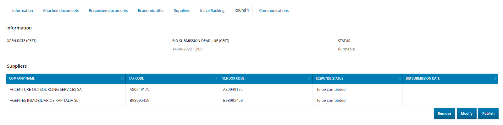 At this stage, the round is not yet active, and from this page, the user can choose to delete its configuration using the ‘Remove’ button, modify it with the ‘Edit’ button, or activate and publish it with the ‘Publish’ button. The ‘Publish’ operation signifies the official opening of the Negotiation phase, and an email invitation will be sent to the selected suppliers.