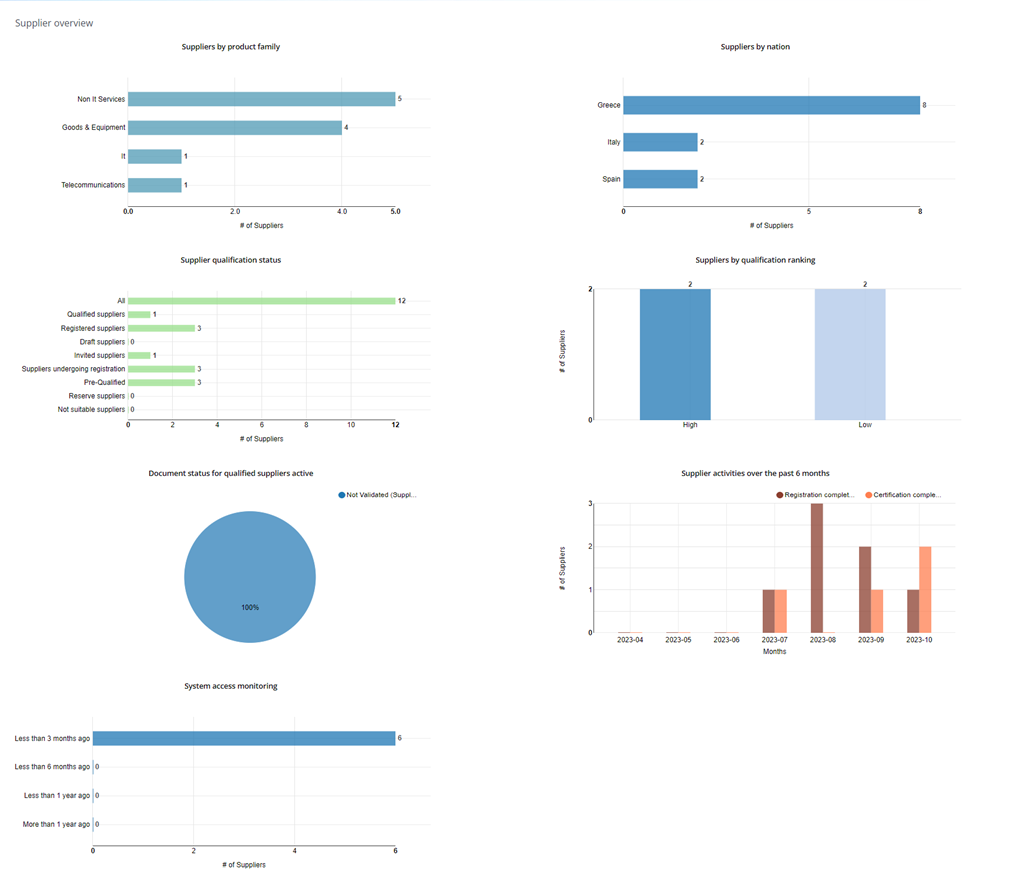 In the Report --> Supplier Overview section, the internal user can access various charts and reports that help monitor the management of the supplier register and its utilization by suppliers. The data that can be consulted includes: