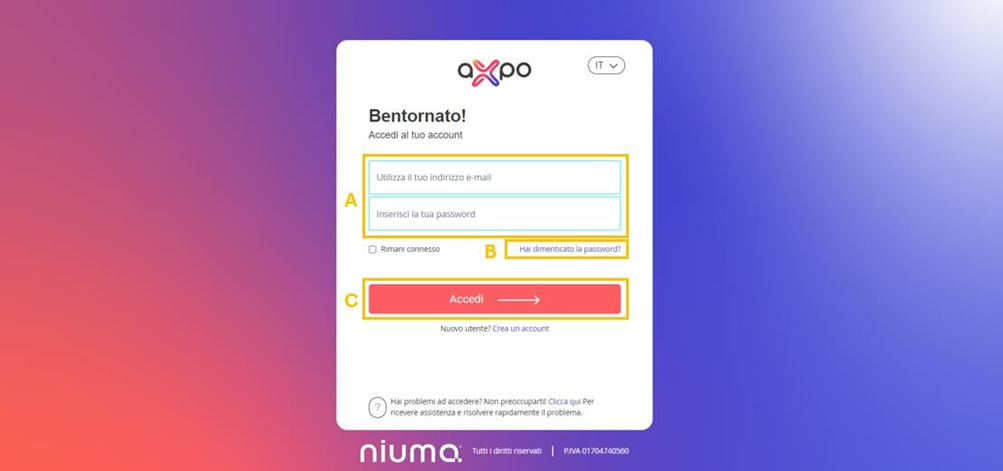 If you need to recover your password, click on "Forgot your password?" (B). You will be prompted to enter your Username, and the system will send an email to your address with a new password for access.