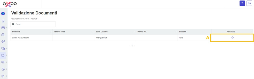 • Document Validation: In this section, you can proceed with the validation of documents uploaded by suppliers. Through the "View" column (A) (see Figure 19), you can review the details of the documents pending review and proceed with their validation (using the icon