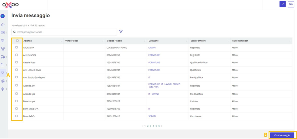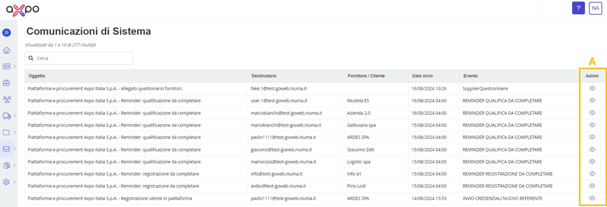 • System Communications: This section contains the list of communications sent by the platform to both internal users and suppliers. The visibility of the communication depends on the user's profile configuration. You can view the details of the message content using the Actions column (A) (see Figure 19) by clicking on the eye icon.