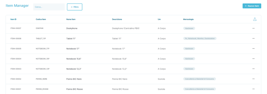 The Item Manager section, accessible via the sidenav through the icon , contains the details of items to be added as positions in a new Purchase Request, Quotation Request, or Order. You can view its content by clicking the designated icon. Upon clicking, a page will open as shown below: