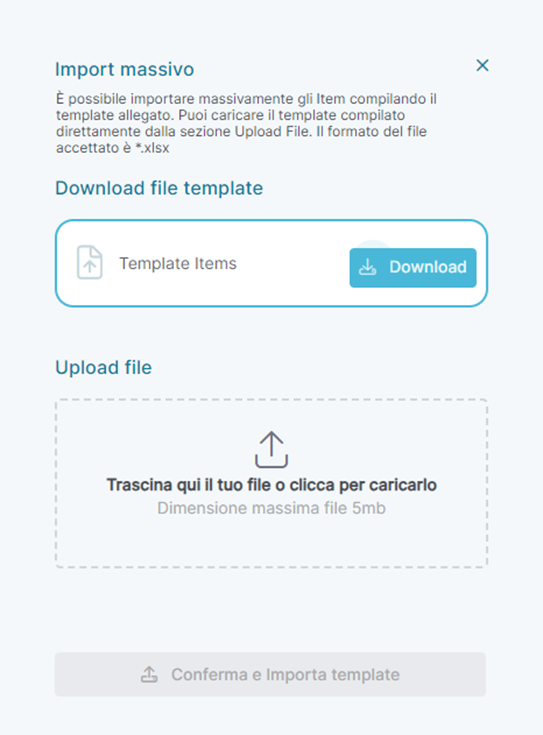 - Pressing the button will open a section on the left side of the Portal where you can download the bulk template to be re-uploaded later with the Items you wish to import. Below is a screenshot of the section: