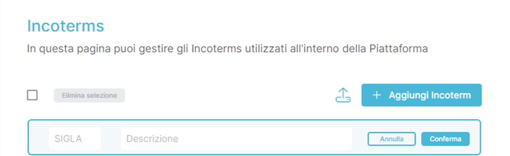 ) of an Incoterm, the portal displays the fields to be filled in (CODE and Description). Below is a screenshot of the section: