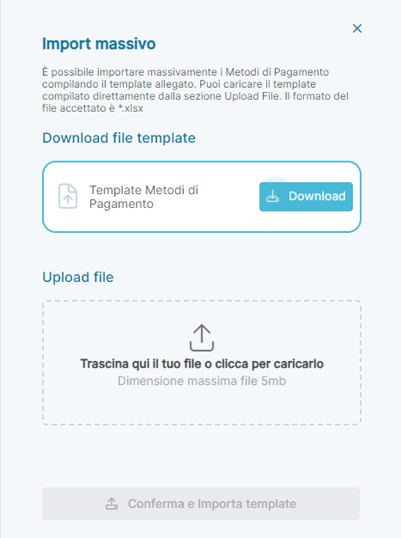 - La pressione del bottone aprirà una sezione alla sinistra del Portale dove è possibile scaricare il template massivo da ricaricare direttamente in Piattaforma con i Metodi di Pagamento da importare. Segue schermata della sezione: