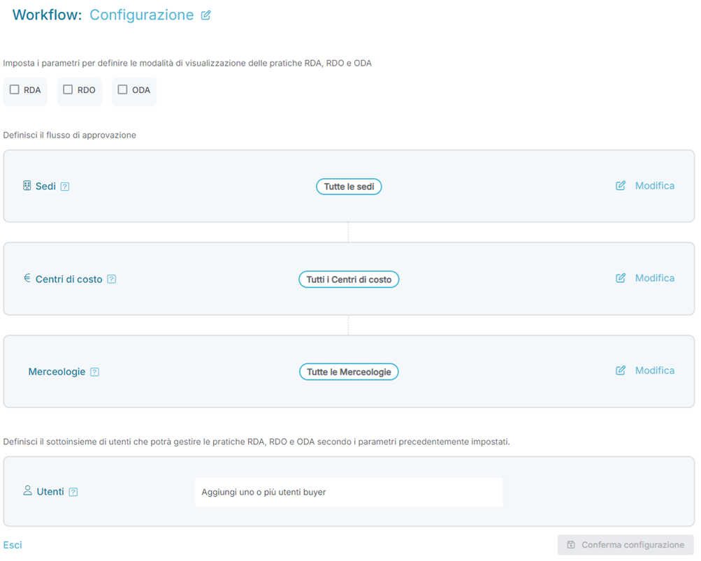 The Approval Workflow section contains references to the approval flows that can be associated with Purchase Requests (RDA), Request for Quotations (RDO), and Purchase Orders (ODA). You can view the configured rules by clicking on the appropriate icon. When the mouse is clicked, a page like the one shown below will open: