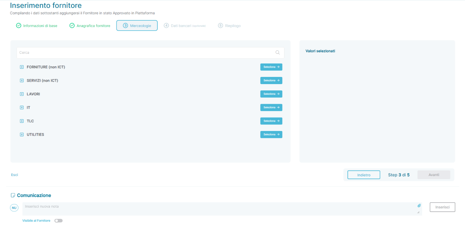 The third page of the stepper is dedicated to the registration of the supplier's profile, where you can associate merchandise categories with the supplier.