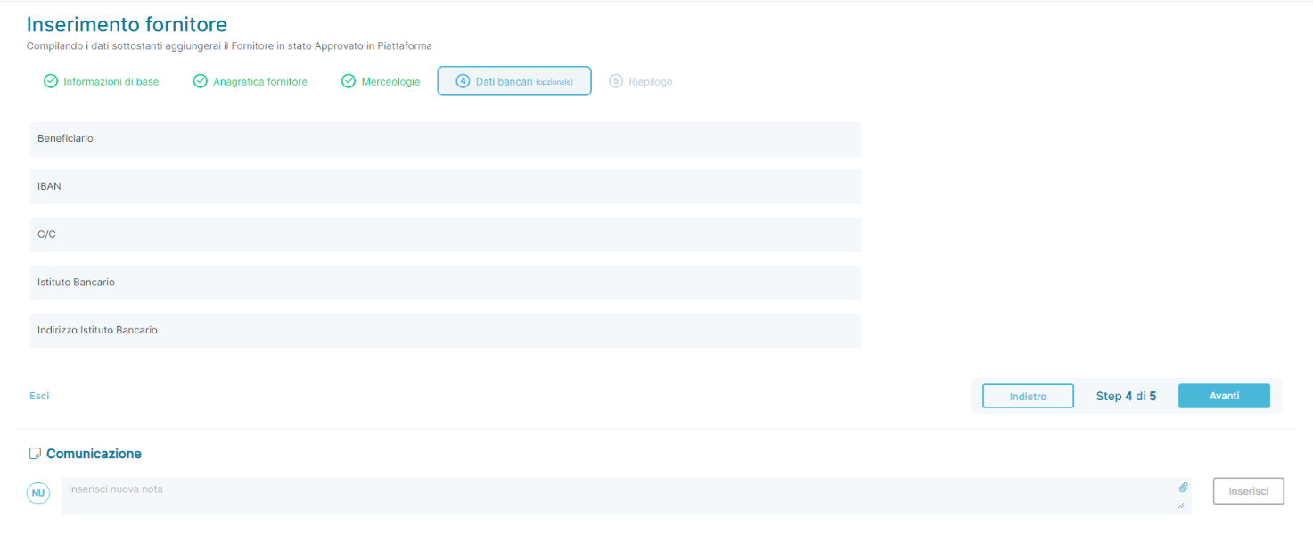 The fourth page of the stepper is dedicated to entering the supplier's bank details.
