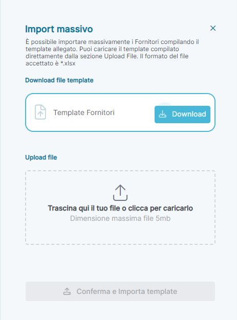 . Pressing the button will open a section on the left side of the portal where you can download the bulk template to re-upload directly into the platform with the suppliers to be imported. Below is a screenshot of the section: