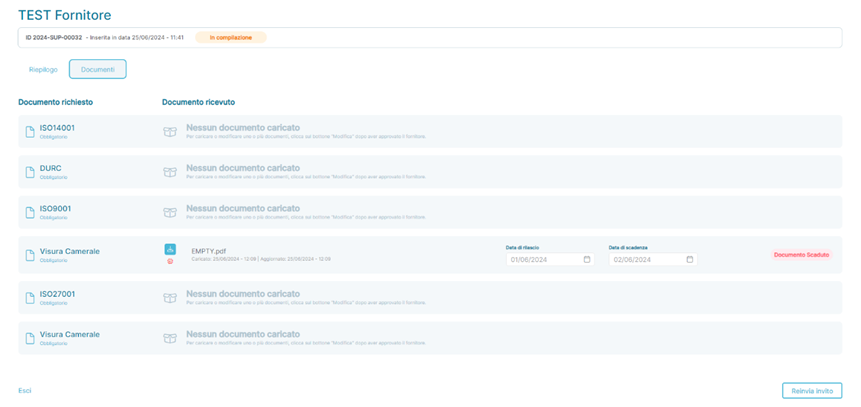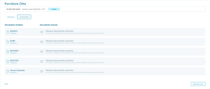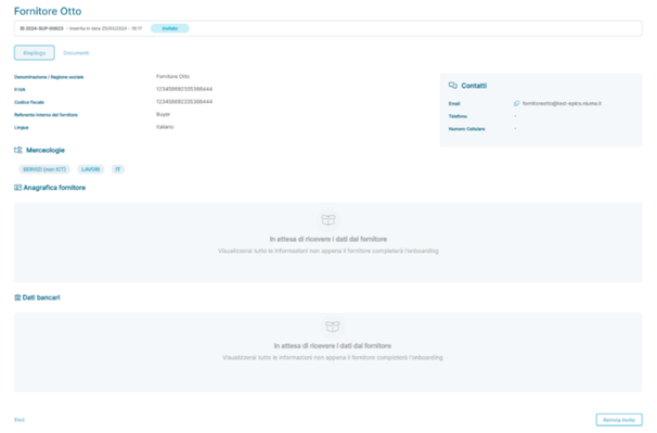 In this application state, the supplier has not completed the onboarding process, and not all detailed information about the supplier is present. However, the supplier has saved the partial data entered to continue the compilation at a later time. At this stage, it is only possible to resend the invitation to the supplier containing the link to start the onboarding process by clicking the button
