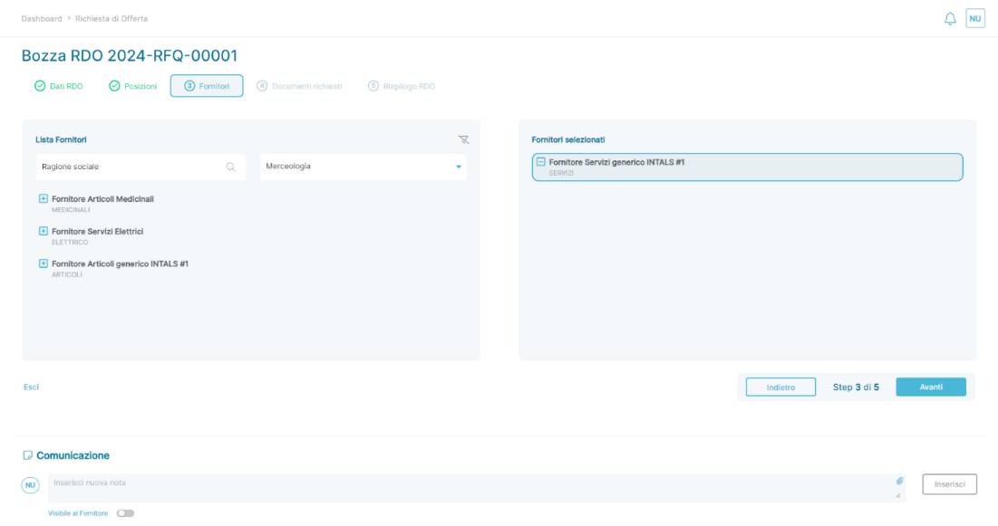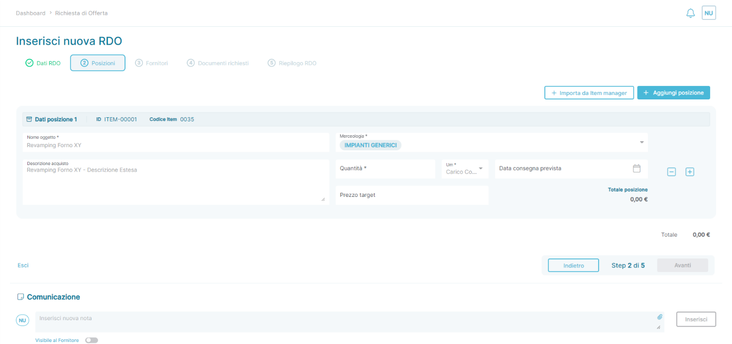 NOTE: In the case of a Request for Quotation generated from a Purchase Request, the fields indicated in the following paragraphs will already be populated with the data inherited from the Purchase Request and can be modified in every aspect by the User. Conversely, in the case of a new Request for Quotation, the data must be filled out individually section by section.