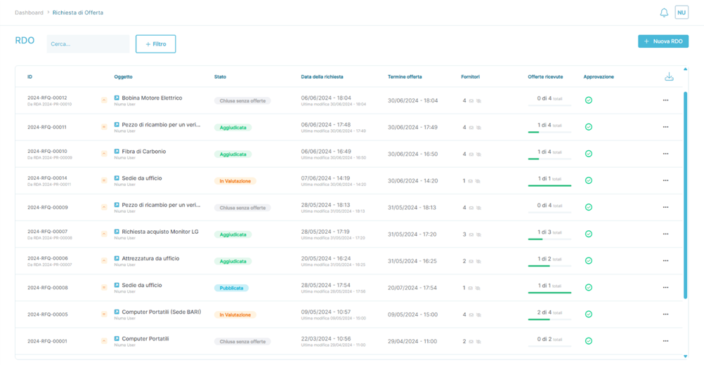 the icon present in the sidenav, the User is redirected to the RDO section, from which it is possible to view a list containing information about the RDOs already recorded in the Platform. Below is an illustrative screenshot of the page: