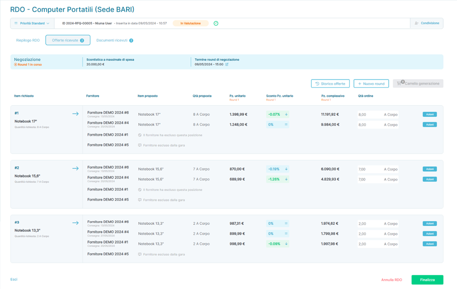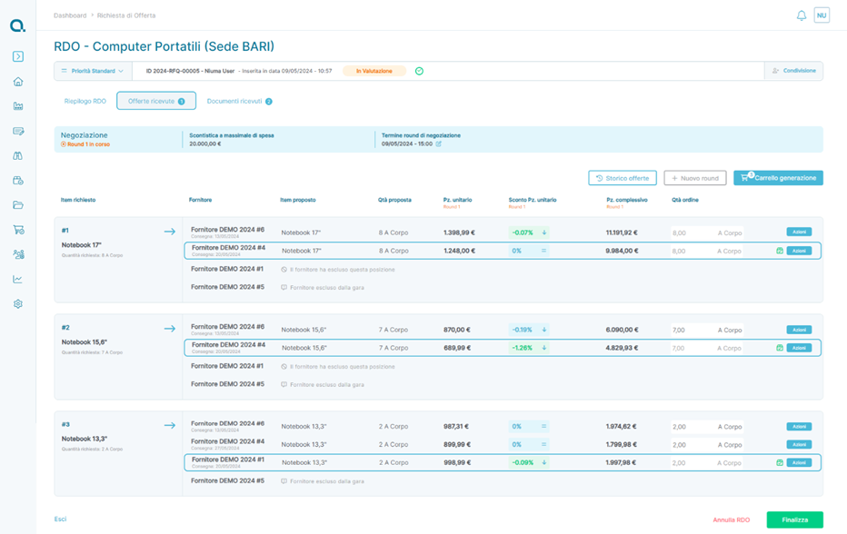 The awarding of the RDO is based on a series of actions that the internal Platform User can take on the individual Positions for which offers have been submitted by the Supplier: