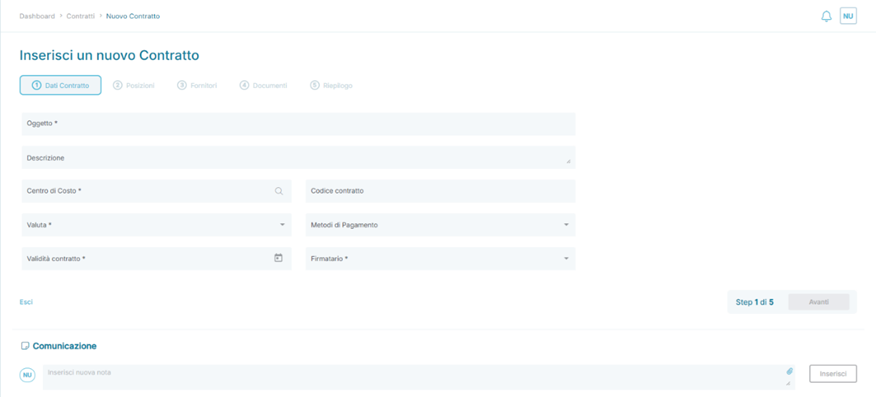 The creation of a Contract is divided into four steps plus one that serves as a summary of the data entered in the previous sections: