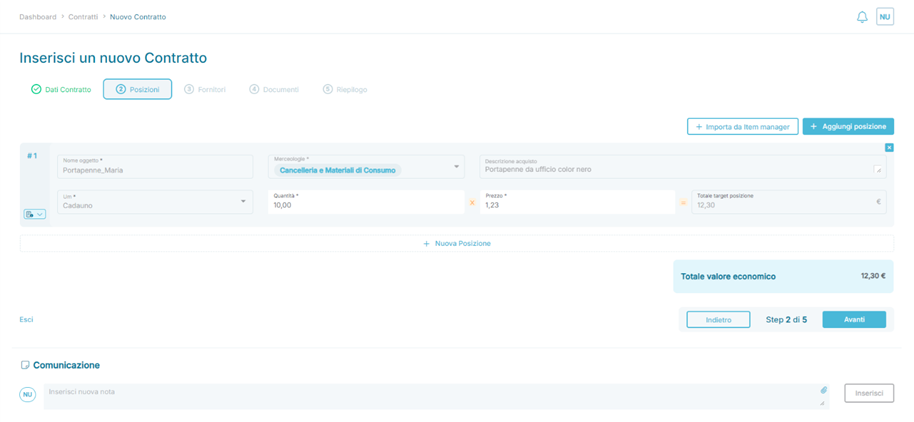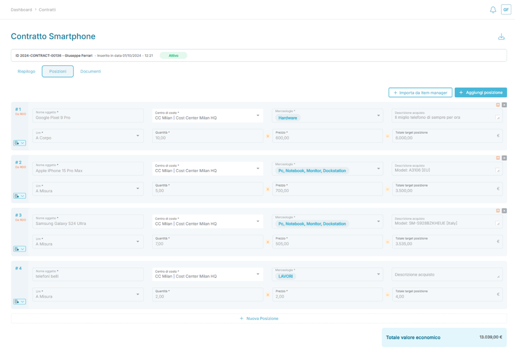 or by clicking on the section label being modified: Contract Data, Positions, Suppliers, or Documents)( modifica (