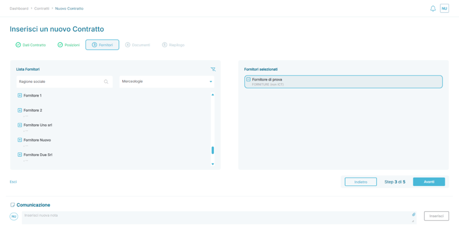 The Suppliers section allows the addition of the Supplier with whom the Contract was signed, selected from those in the Approved or Blacklist statuses in the Supplier Registry.