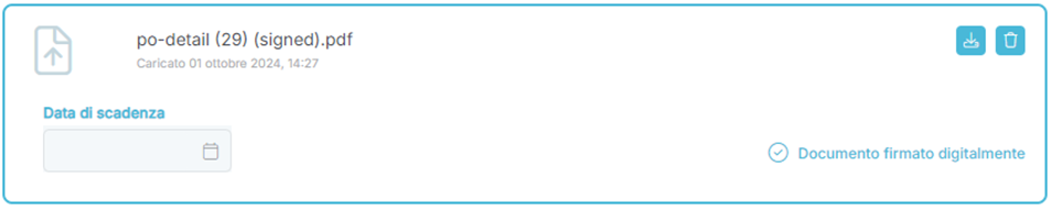 When a document is uploaded, if it is digitally signed, the Portal informs the User of the presence of the Digital Signature through a dedicated text label inside the document box. There is also a section