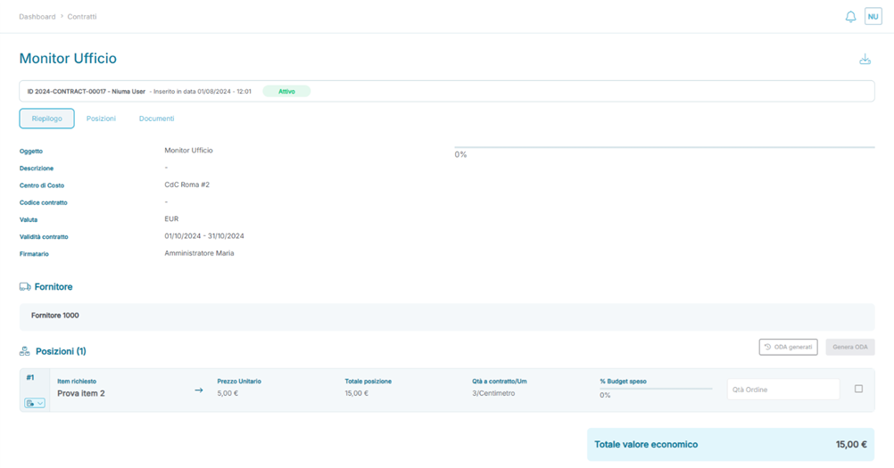 The Summary section provides an overview of the information entered during the contract creation phase. Within the Positions section of the page, it is possible to generate Draft Orders based on the contract.