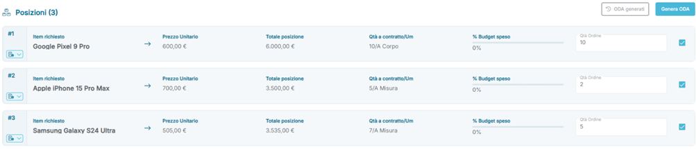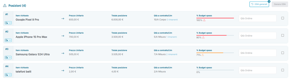 that allows them to enter a numerical value equal to or less than the quantity assigned to that specific position. This enables the ORBIT User to create a Draft Order from the contract for all or a subset of the planned quantities. If a quantity greater than that associated with the position is entered, the platform will indicate the impossibility of processing the position by highlighting the section with a red box (