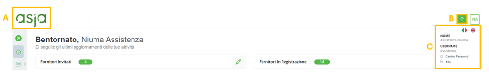 The header displays the company logo, the user area (which shows the username and allows for changing the display language between Italian/English, changing the password, and logging out), as well as access to helpful articles/guides and technical support.