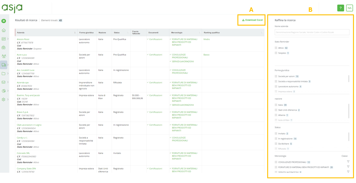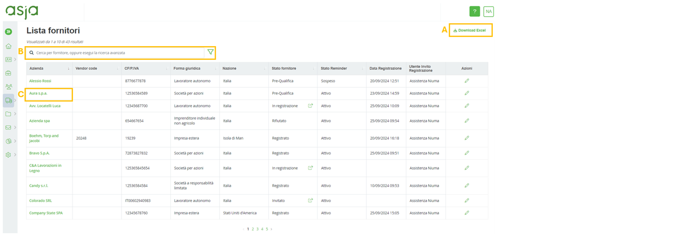 Furthermore, internal users have the option to extract vendor information by clicking on the “Download Excel” button (A), located in the upper right corner of the page; there is also the possibility to filter vendors using the search filter tool (B). By clicking on the specific company name (C), users can view the complete vendor profile.