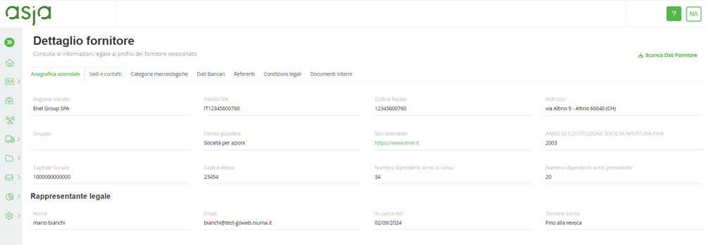 In the “Vendor Details” page (see Figure 11), internal users can view the information entered by the vendor during registration: company profile, locations and contacts, product categories, banking details, and representatives. Additionally, in the same area, users can not only consult the legal conditions accepted by the vendor but also upload any internal documents visible only to the user side.