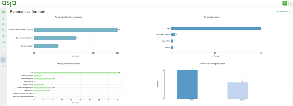 The Report section (ref. Figure 23) contains a series of graphs, useful for monitoring the management of the register and its use by suppliers. In particular, the data that can be consulted are:
