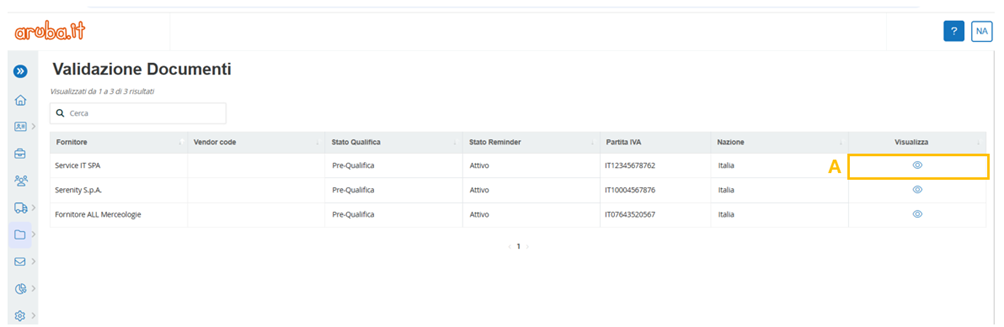 - Document Validation: in this section it is possible to proceed with the validation of documents, uploaded by suppliers. Using the ‘View’ column (A) (ref. Figure 3), it is possible to consult the details of the documents waiting to be viewed and proceed with their validation (using the icon ) or rejection (using the icon ).