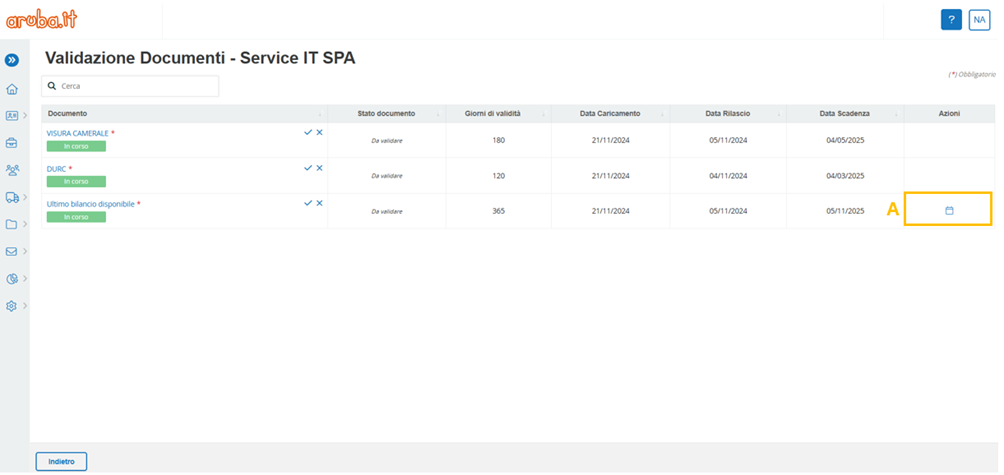 In the Actions column, on the other hand, there is the icon, which allows the internal user to view the history of previously loaded documents (A) (ref. Figure 4).