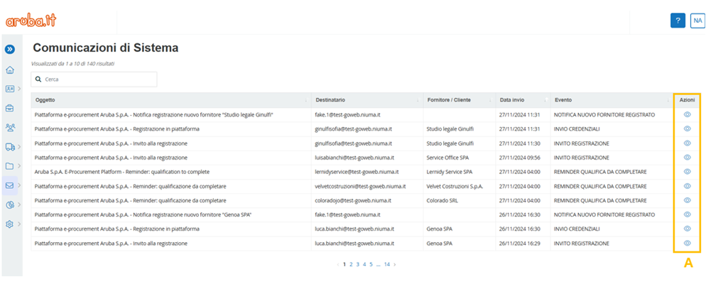 - System Communications: contains the list of communications sent by the platform to both internal users and suppliers. Communication visibility is based on the user profile configuration. It is possible to view the details of the content, relative to the message, using the Actions column (A) (ref. Figure 1), with a click on the wink icon.