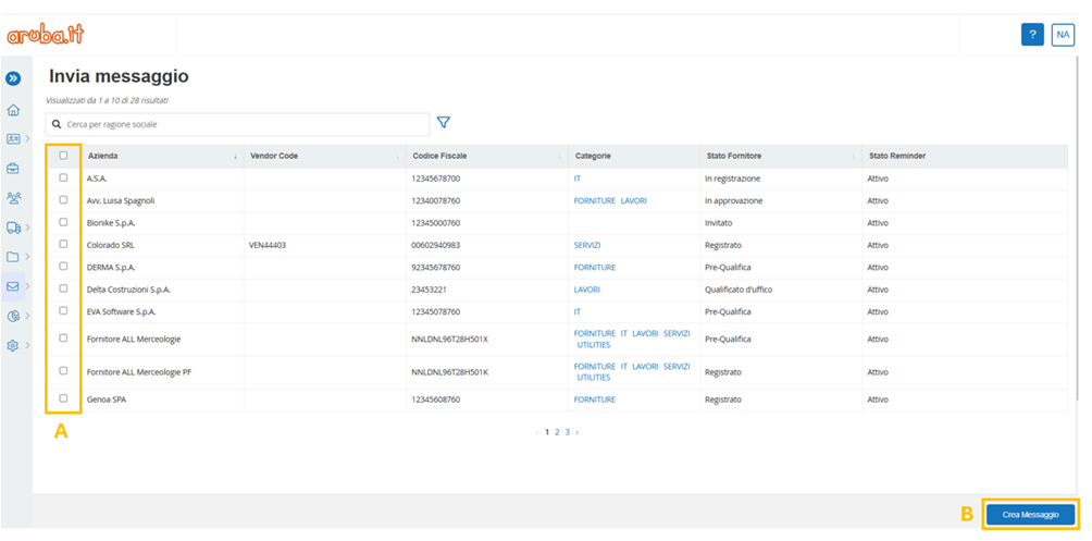 - Send Message: this area allows the internal user to send customised communications by clicking on the ‘Create Message’ button (B) to one or more suppliers in bulk by ticking the box (A) (ref. Figure 2).