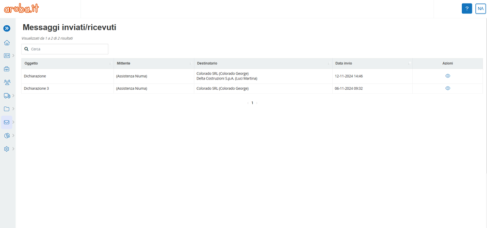 Figure 3. Aruba S.p.A. Portal: ‘Messages sent/received’ section