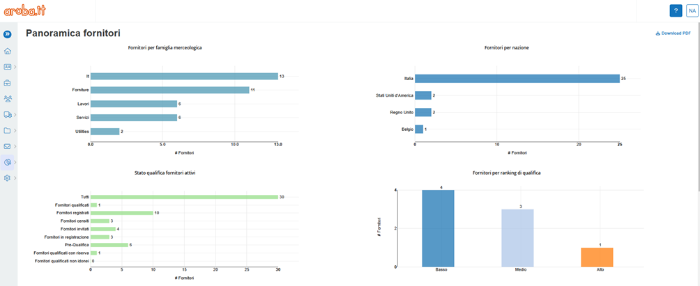 The Report section (rif. Figure 1) contains a series of graphs, useful for monitoring the management of the register and its use by suppliers. In particular, the data that can be consulted are: