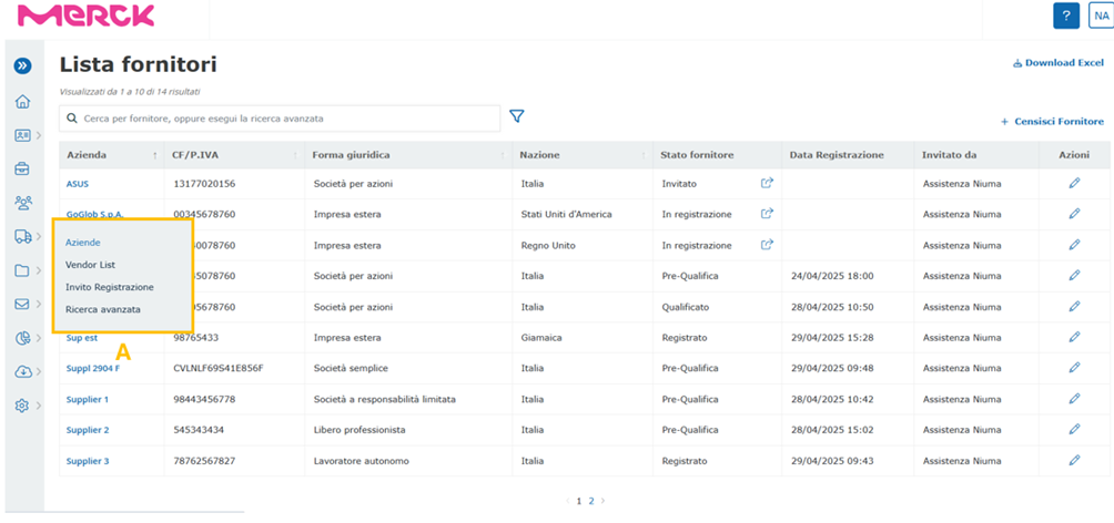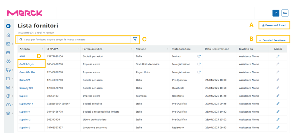 Clicking on the specific company name (D) allows you to view the complete supplier master data. While if one wants to census a supplier in the platform, without necessarily sending a registration invitation, the user can click on the “Census supplier” button (B).