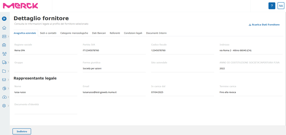 Within the “Supplier Detail”, the internal user has the option of viewing the information entered by the supplier during registration: master data, locations and contacts, commodity categories, bank details and contact information. In addition, within the same area it is possible not only to consult the legal conditions accepted by the supplier, but also to enter any documents for internal use.