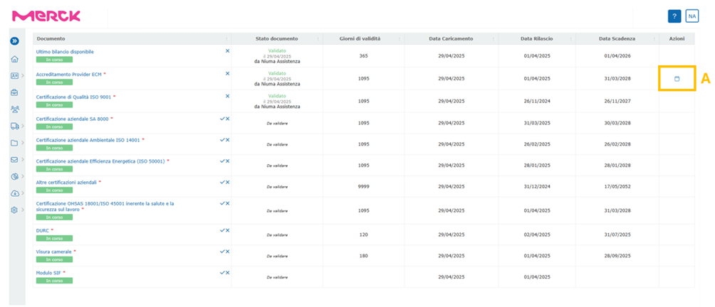 - Document Validation: in this section it is possible to proceed with the validation of documents, uploaded by suppliers. Using the “View” column (A), it is possible to consult the details of the documents waiting to be viewed and proceed with their validation (using the icon