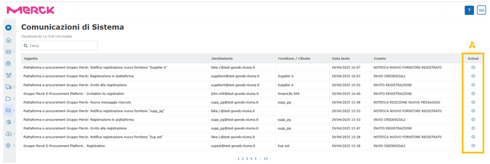 - System Communications: contains the list of communications sent by the platform to both internal users and suppliers. Communication visibility is based on the user profile configuration.