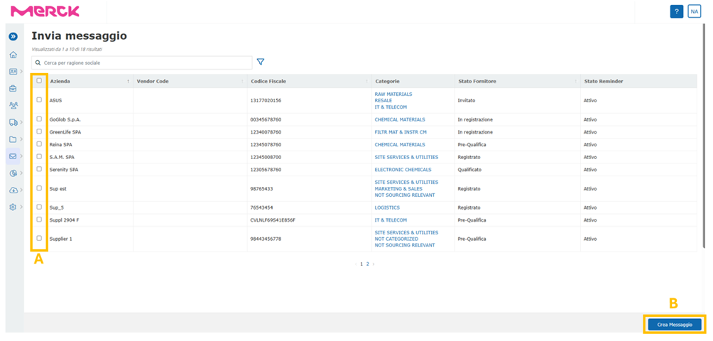 - Send Message: the area allows the internal user to send customized communications by clicking on the appropriate “Create Message” button (B) to one or more suppliers massively by placing a check inside the box (A).