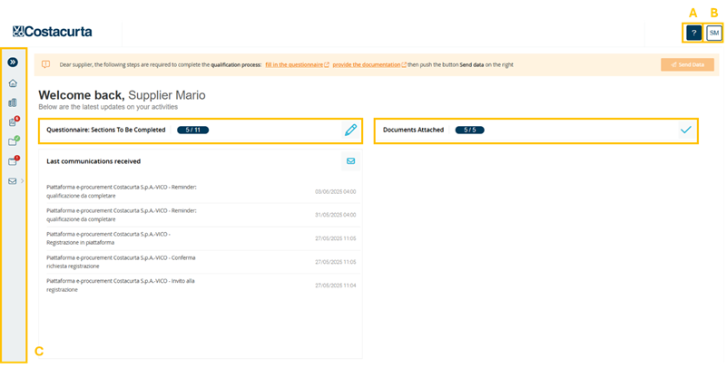 C. Main Menu (C): through this menu, the supplier can view and edit company data, questionnaires, documents, their bank details and communications received.