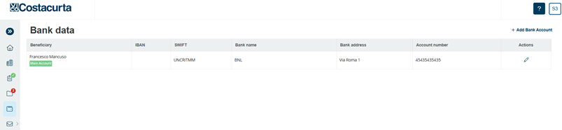 Within the ‘Bank Data’ section (Figure 8), the supplier can enter the details of his bank data with the possibility of entering one or more Bank Accounts.