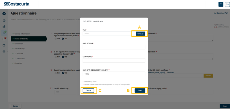 While filling in the questionnaire, the supplier will be asked to attach documents (mandatory and not) (Figure 6). In order to attach a document, when the relevant pop-up opens, it is necessary to click on the Upload button (A) and enter the date of issue of the document in question. In order to save the document insertion, the supplier must proceed by clicking on the Save button (B); on the contrary, if he wants to go back without saving the insertion, use the Cancel button (C) (Figure 6).