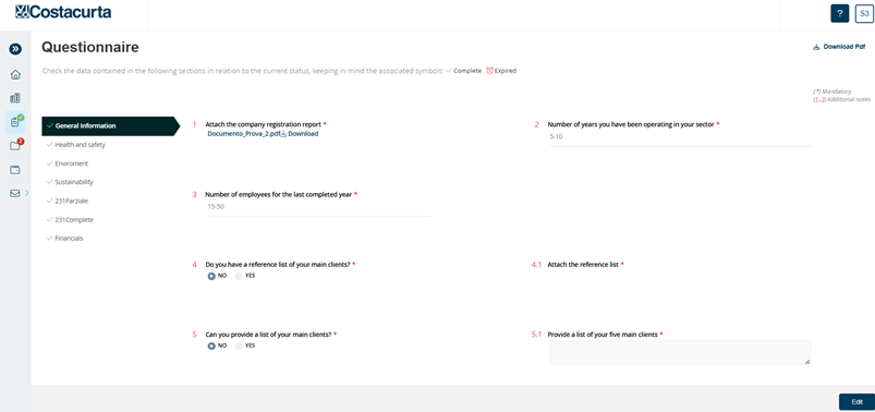 Should the supplier need to download the file relating to the questionnaire, he may click on the ‘Download pdf’ button (A) present on each page of the questionnaire.