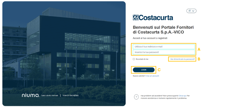 If the supplier has forgotten his password, he will have the opportunity to change it using the ‘Forgot your password?’ link (B).